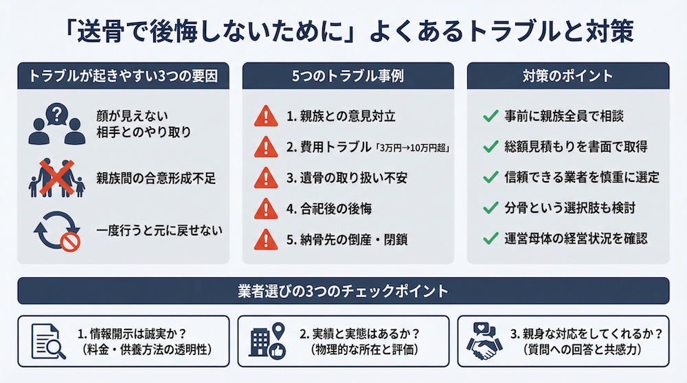 手軽さや費用の安さが魅力の送骨ですが、その裏にはトラブルにつながりやすい要因が潜んでいます。
