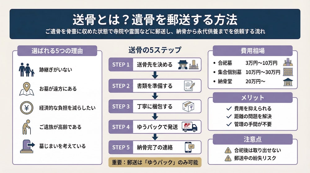 | 基本的な流れ | ①送骨先を決定 → ②必要書類を準備(埋葬許可証など)→ ③ご遺骨を梱包 → ④ゆうパックで発送 → ⑤納骨完了の連絡を受け取る |